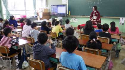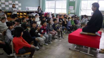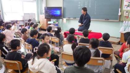 立命館大学落語研究会・京都大学落語研究会の演者の皆様をお迎えし,各学年で落語教室をしていただきました。学年にあわせた演目をしていただき,落語の世界を楽しんでいました。