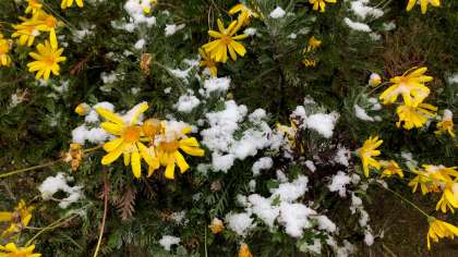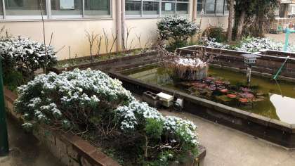 昨夜遅くからの雪で,校内の観察池や花壇などにも雪が積もっています。雪がうれしい子ども達も多いようです。
