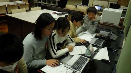 今日は,5年1組がコンピュータ室でタブレットを使って学習しています。どのようにすると,コンピュータに正方形や正多角形を描く動作をさせることができるかについて考えたり,試したりしています。