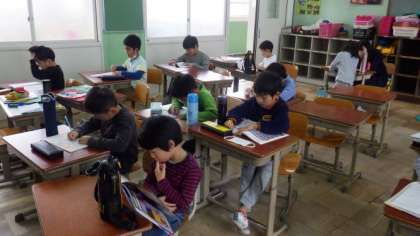 教室で自学自習をして過ごしています。合間には外でドッジボールなどをして遊んだり,映像教材をみたりしています。
