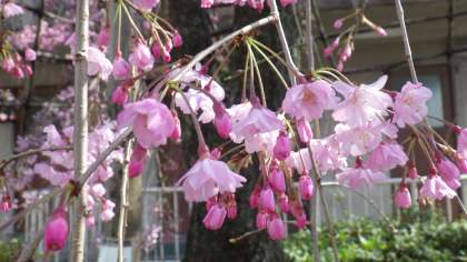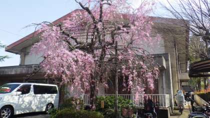 正門前のしだれ桜がたくさん花を咲かせ始めました。まもなく満開になりそうです。