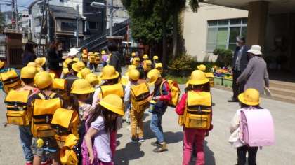 1年生は,教職員と一緒に並んで下校します。今日は,初めて集団下校しました。