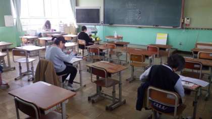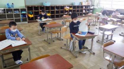 特例預かりで,学校で過ごしている子どもたちもいます。教室では,学習したり絵を描いたり,映像教材をみたりして過ごしています。