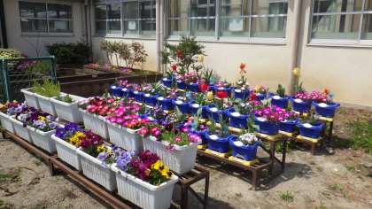 昨年度,おやじの会やPTAの皆様,地域の皆様にお世話になり,禽舎を撤去していただきました。その場所を使って今年度は,子どもたちが一人一鉢で育てている鉢を置いています。