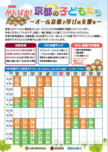 臨時休業期間の5月31日(日)までの延長に伴い,小学校1年生〜3年生対象の番組も新たに加え,小学1〜中学3年生の各学年で,5月に学習する単元を中心とした「特別教育番組」を,5月18日(月)から5月29日(金)にKBS京都で放送します。