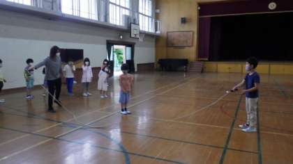 1・2年生と3〜6年生で時間帯を決めて遊びました。1・2年生は大なわとび,3〜6年生は一人でボール遊びをしたり,「だるまさんがころんだ」をしたりしていました。
