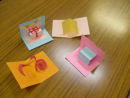 『幸せを運ぶカード』は,教科書40・41ページを参考にして作ってください。先生たちもしかけを作ってみました。これからかざりつけをします。みんなの作品を見るのが楽しみです。