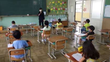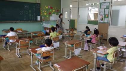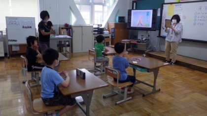 今日は,B班(名字が「た」〜「わ」で始まる児童,3組)が登校しました。各教室では,学習をしたり,映像教材を使って正しい手洗いの仕方を練習したりしています。