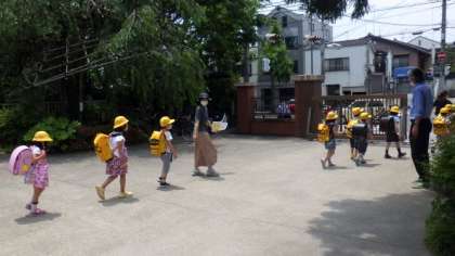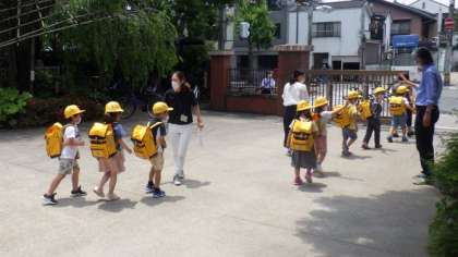 グループごとに並んでから,教職員が引率して下校しています。グループに並ぶのも,上手にはやく並ぶことができるようになっています。