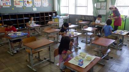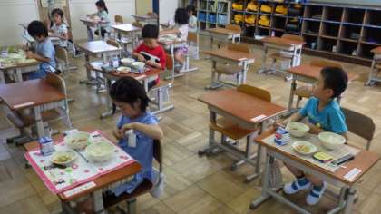 はじめての給食に,どきどきしている1年生もいたようですが,みんな時間内に食べることができました。なかには,おかわりをしている子どもたちもいました。