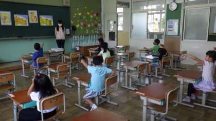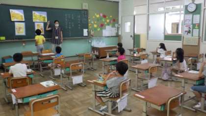 物語文「はなのみち」の挿絵を見て,気づいたことを指し示しながら,みんなに伝えています。