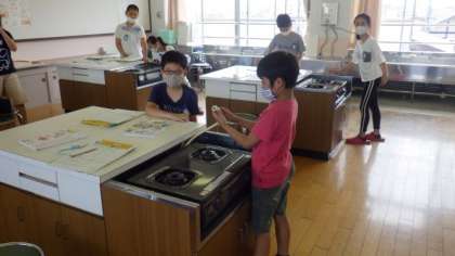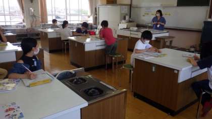 家庭科では,家庭科室の使い方やコンロの扱い方を学習しています。外国語科では,英語の自己紹介文から,どんなことを話しているか,名前のつづりはどんなアルファベットか,などを聞き取っています。