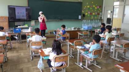 1年生は,教職員で配膳をしています。待っている間,昨年度の給食委員会の5・6年生が作った,給食ができるまでの動画をみながら待ちました。1年生は,とても興味深くみていました。