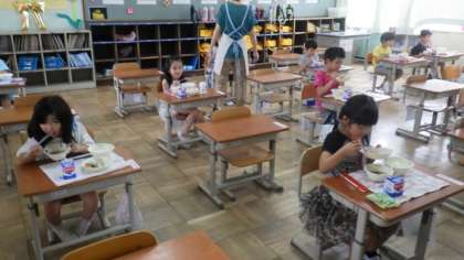 今日からB班の給食が始まりました。B班の1年生にとっては,小学校で初めての給食です。