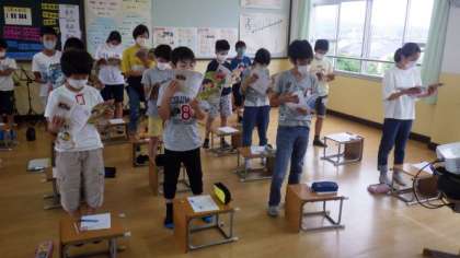 今日は曲想を感じ取りながら,気持ちをこめて「つばさをください」を歌う学習をしました。感染症対策のため,マスクをつけて小さな声で歌っています。