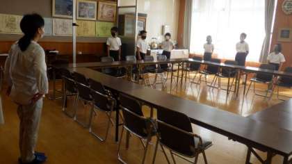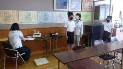 今日は6年生の身体測定を行いました。通常は保健室で行いますが,今回は「3密」を避けるために,ふれあいサロンで行います。床に印をつけて,待つ時間もソーシャルディスタンスをとるようにしています。