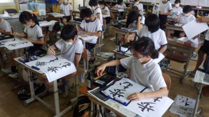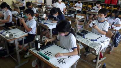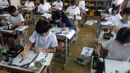 漢字とひらがなの文字の大きさや配列に気を付けながら,毛筆で『歩む』と書く練習をしています。