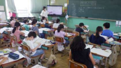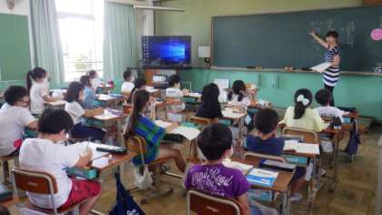 4年2組は社会で,京都府の様子について学習しています。4年1組は算数で,わり算のひっ算について学習しています。5年生は社会で,低い土地のくらしについて,資料を見て気づいたことを発表しています。