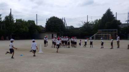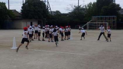 リレーの学習をしています。感染症対策としてバトンの共有をしないために,2本の線をひき,その間で次の走者に交代するようにしています。