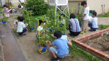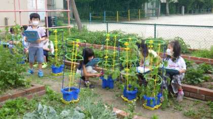 一人一鉢で育てているアサガオが,大きく育っています。なかには,花が咲きはじめたものもあります。今日は,自分のアサガオをよく観察しながら,カードに絵や言葉でかいています。
