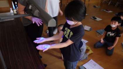 いつも丁寧な手洗いをしている子どもたちですが,ライトで確かめた後の手洗いは,さらに丁寧になっていました。