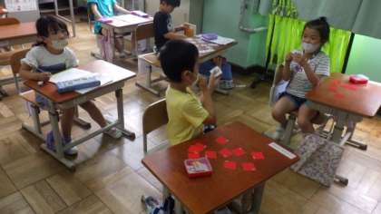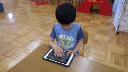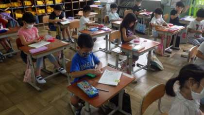 1年生は算数「いくつといくつ」の学習で,ノートに図をかいたり,数字カードを使って練習したりしています。3組は国語で,タブレットを使ってひらがなの学習をしています。