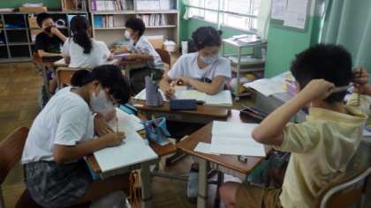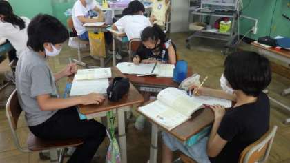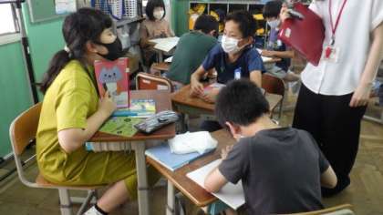 クラスの仲間の新たな一面を見付けるインタビューをしています。メモもとりながら,交代で楽しくインタビューをしています。