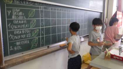 ジャガイモの葉をヨウ素液につけています。いろいろな条件の葉の中に,デンプンが含まれているかどうかを調べ,記録しています。