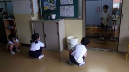 保健室で心電図をとっています。間隔をあけて順番を静かに待っています。