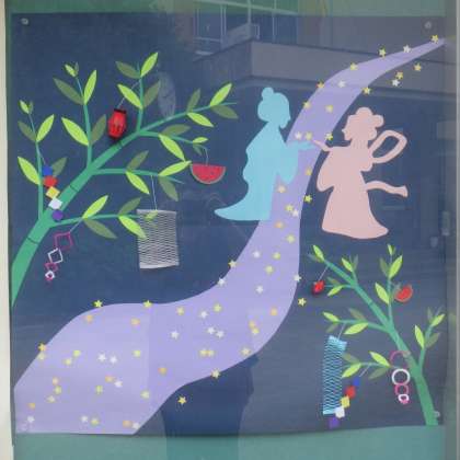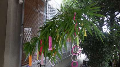 校内の掲示板や校舎の入り口に,七夕かざりをつけています。