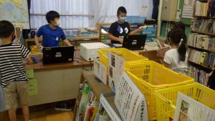 「新しい生活スタイル」にあわせた方法で,学校図書館を開館しています。図書委員会の5・6年生も,本の貸し借りの仕事に慣れてきたようです。