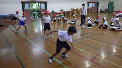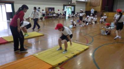 雨天のため,今日は体育館で行う種目のみを実施しました。4年生は,反復横とび・立ち幅とび・長座体前屈を行いました。
