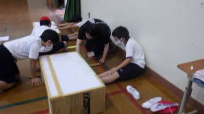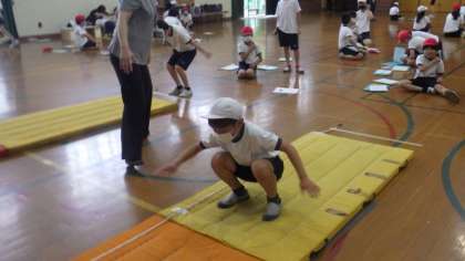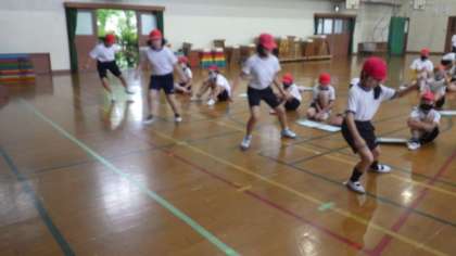 雨天のため,今日は体育館で行う種目のみを実施しました。5年生は,反復横とび・立ち幅とび・長座体前屈を行いました。