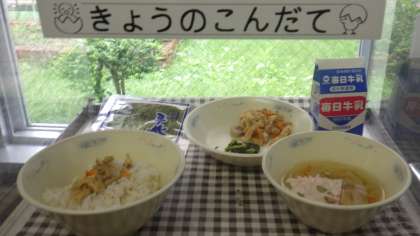 こぎつねちらしの具は,自分で麦ごはんに混ぜて食べました。1年生も自分で手巻のりに上手に巻いて,楽しく食べていました。