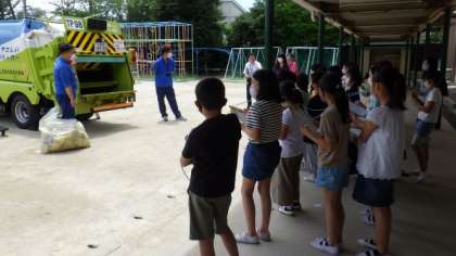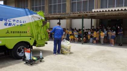 今回は,電動パッカー車を見せてくださいました。ごみを回収する様子や,クリーンセンターでどのようにごみを集めるか,実際に電動パッカー車を動かして見せてくださると,子どもたちからは「すごい。」と驚きの声がたくさん聞こえました。