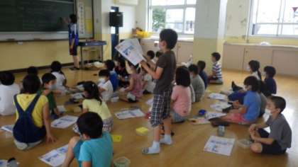 音楽室で,楽器を使って実験しています。音の大きさを変えたときの物の震え方の違いを比べながら調べています。
