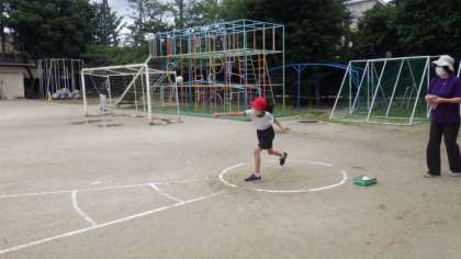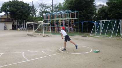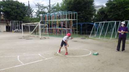 先日雨のため実施できなかった「ソフトボール投げ」を,今日実施しました。より遠くへ投げることができるよう,力いっぱい投げていました。