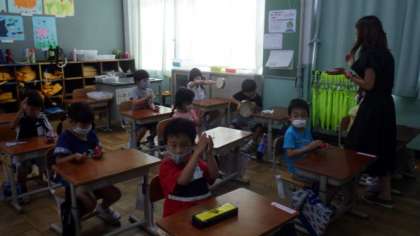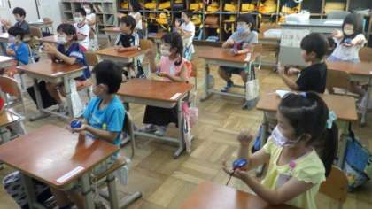 1年生は「しろくまのジェンカ」の音楽に合わせて,カスタネットやタンブリンでリズム打ちをしたり,体を動かしたりして楽しんでいます。3組は「にじ」の音楽に合わせて,楽しく歌ったり手話の動きを覚えたりしています。