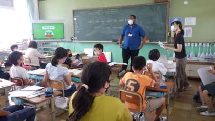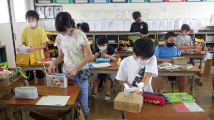 5年生はALTの先生と一緒に外国語の学習をしています。6年生は図画工作「くるくるクランク」で,クランクの仕組みを活かしながら,自分が考えたアイデアをもとに作品をつくっています。