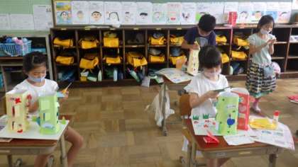 形や色を考えながら,思い付いた窓の形,開き方,中の様子などを工夫してつくっています。