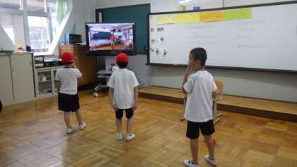 交流会で行う準備体操の練習を楽しんでいます。