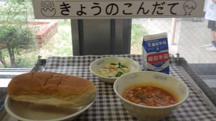給食で使っている食材で鉄を多くふくむ食べ物は,牛肉・油あげ・ほうれん草・小松菜・たまご・いわし・大豆・高野どうふなどです。今日の給食では,「大豆」に鉄が多くふくまれています。