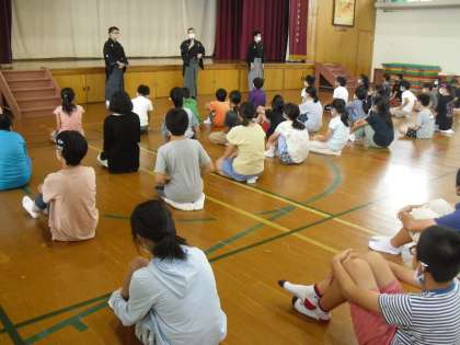 今日の3・4時間目は,文化庁の「文化芸術による子供育成総合授業」として,6年生の狂言ワークショップが行われました。本日は「柿山伏」を演じていただいたり,教えていただいたりしました。子どもたちはとても大きな声で台詞を真似していました。11日の金曜日には「しびり」を教えていただきます。
