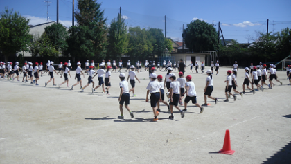 リズムに合わせて隊形移動しています。友達との距離を保ちながらも,心はぴったり合わせて頑張っています。