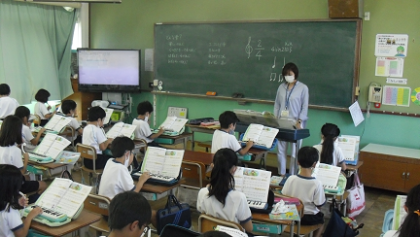 「ゆかいな木きん」のリズムの特徴を感じとりながら,拍にのって演奏しています。