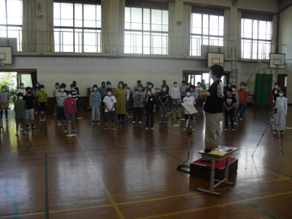 感染予防対策として,全校児童で集まる音楽集会を行いませんので,5・6年生だけで歌っている様子を録画しました。他の学年の子どもたちは各教室で動画をみる予定です。