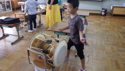 今月の「なかまの日」(人権学習)で3組は,韓国・朝鮮の文化について学習しました。韓国・朝鮮の楽器,チャンゴとプクを体験して楽しみました。