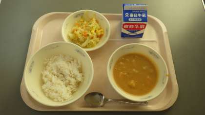 給食の「チキンカレー」は,じっくり煮こんだ手作りのルーがおいしさのひみつです。たくさんの子どもたちがおかわりをしていました。