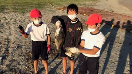 みんなで地引網を体験しました。いろいろな種類の魚をとることができて,とてもうれしそうでした。