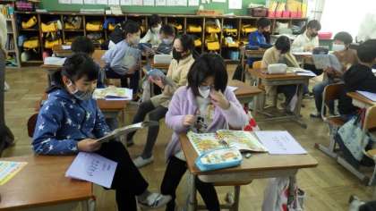 相手に伝わるように工夫しながら,英語でアルファベットクイズを出し合うことを楽しんでいます。